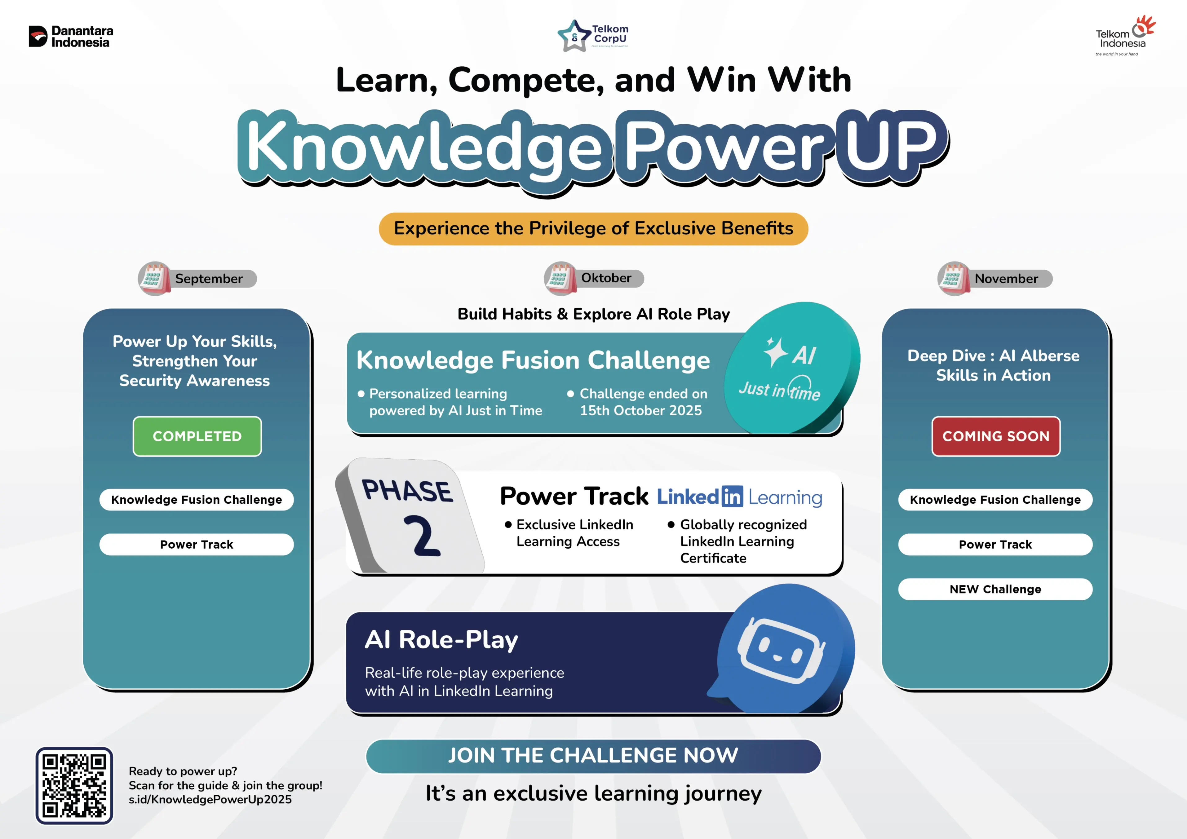 Knowledge Power Up adalah program pembelajaran dan pengembangan diri yang mendorong karyawan mengeksplorasi berbagai topik melalui LinkedIn Learning juga berkompetisi dalam Knowledge Fusion Challenge, yaitu ajang knowledge creation dengan memanfaatkan fitur AI Just in Time di myDigiLearn.